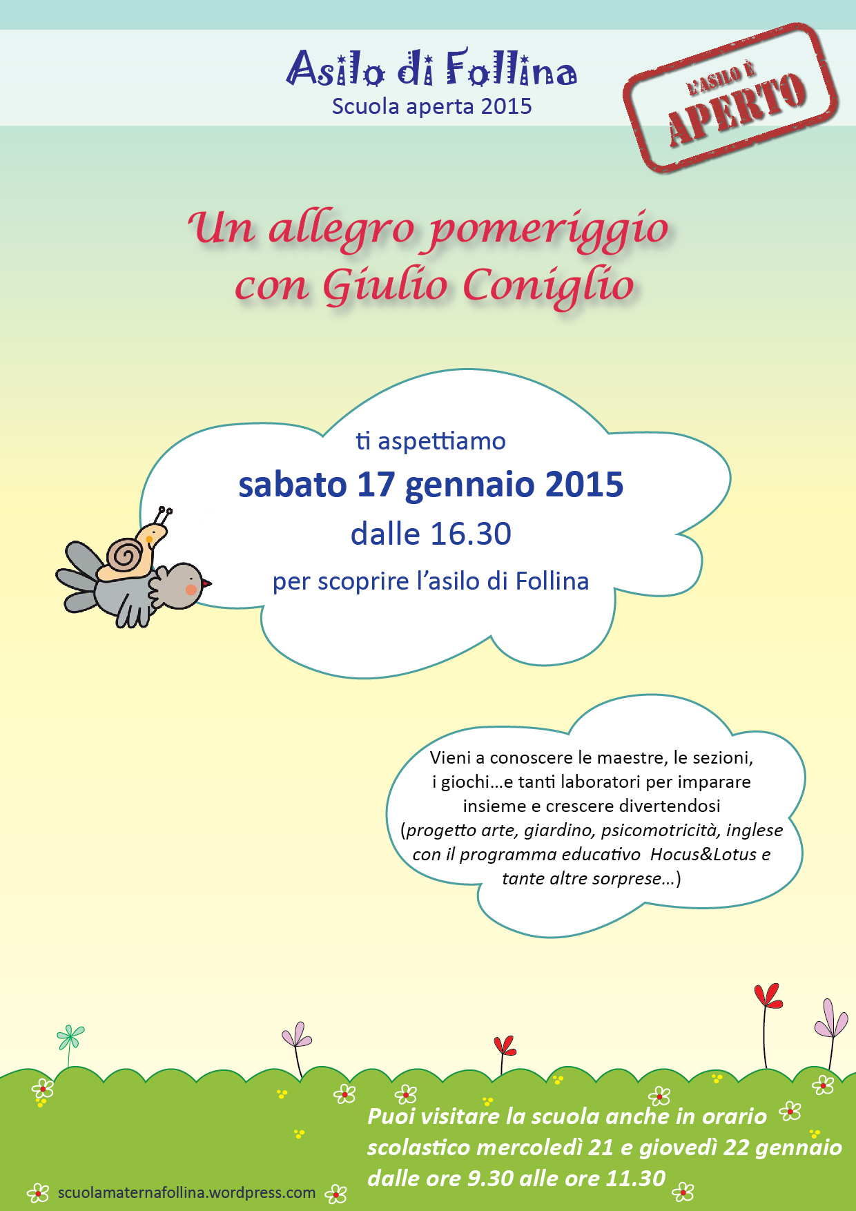 Ricordiamo che nei giorni mercoledì 21 e giovedì 22 gennaio dalle ore 9.30 alle ore 11.30 la scuola è aperta: chi lo desidera può visitare l’asilo mentre i bambini svolgono le loro attività quotidiane con le maestre. Potrete vedere in diretta l’innovativo corso di inglese. Vi aspettiamo.