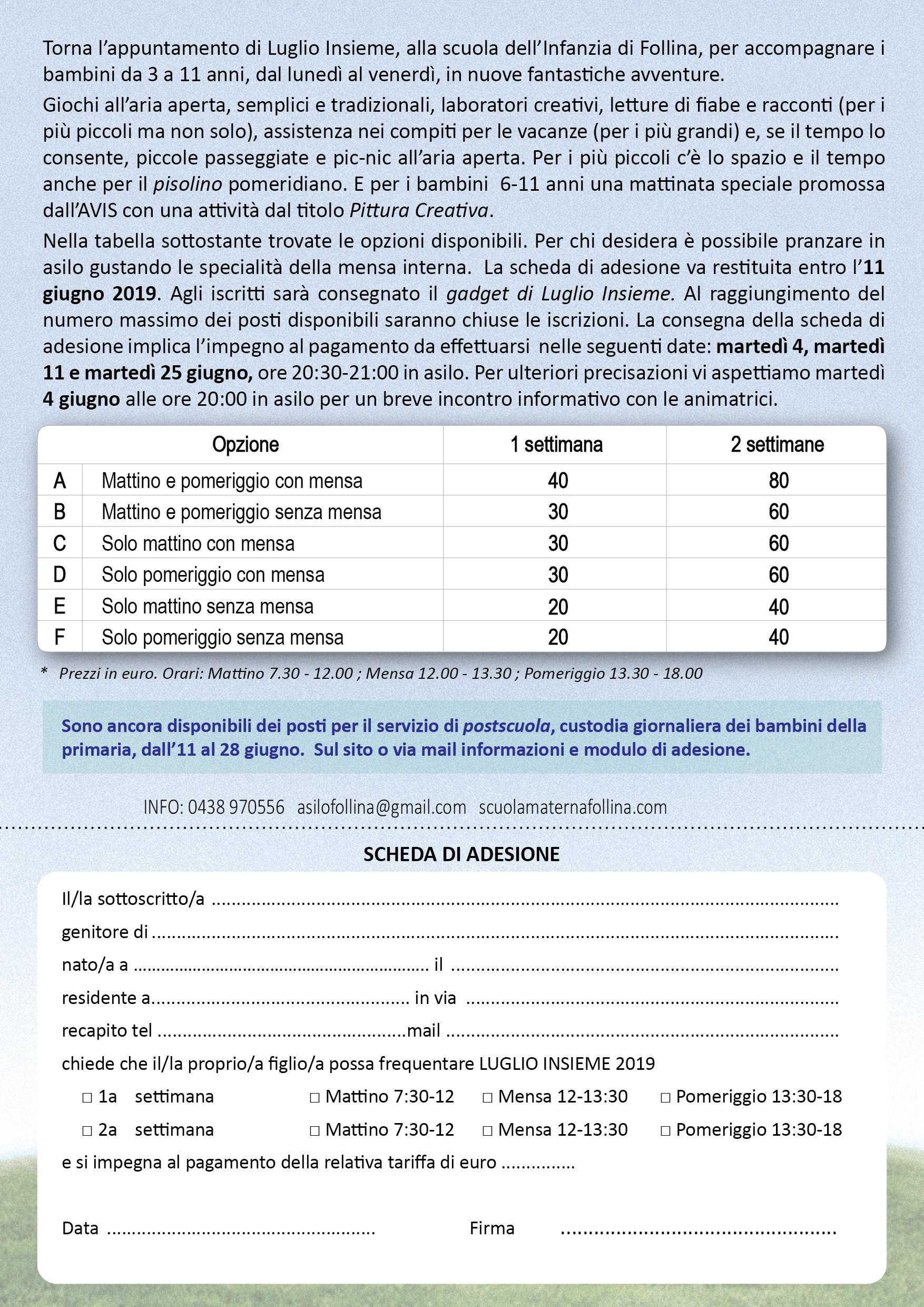 Giochi all’aria aperta, semplici e tradizionali, laboratori creativi, letture di fiabe e racconti, assistenza nei compiti per le vacanze (per i più grandi) e, se il tempo lo consente, piccole passeggiate e picnic all’aria aperta. Per i più piccoli c’è lo spazio e il tempo anche per il pisolino pomeridiano. Novità 2019, per i bambini tra i 6 e gli 11 anni una mattinata speciale promossa dall’AVIS con una attività dal titolo Pittura Creativa.