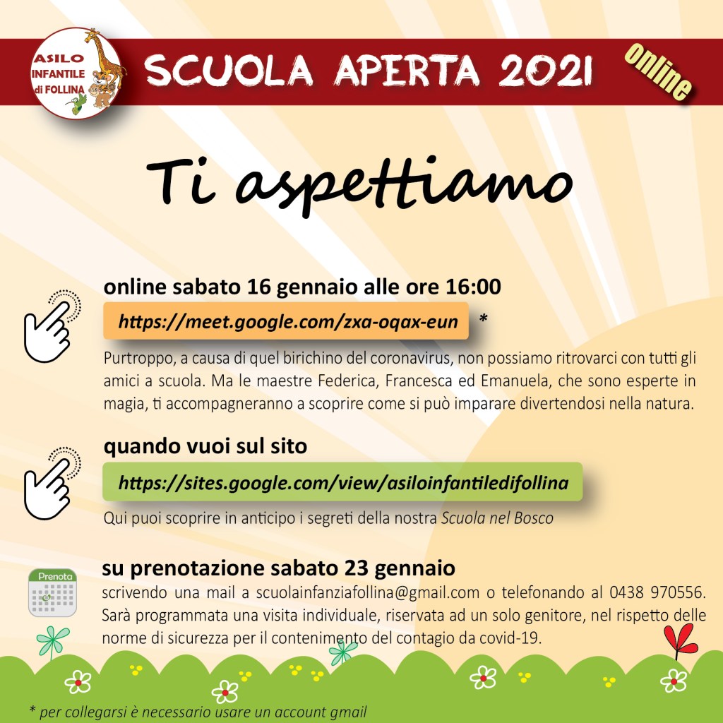 Quest’anno la scuola aperta si terrà online. Sarà sufficiente collegarsi all’indirizzo https://meet.google.com/zxa-oqax-eun usando Googgle Meet (è richiesto un qualsiasi account GMAIL per collegarsi).
