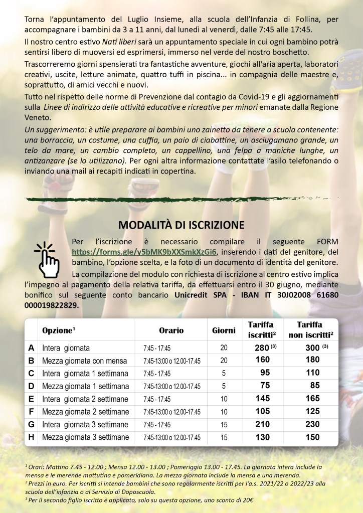Dal 4 al 29 luglio Torna l’appuntamento del Luglio Insieme, alla scuola dell’Infanzia di Follina, per accompagnare i bambini da 3 a 11 anni, dal lunedì al venerdì, dalle 7:45 alle 17:45.